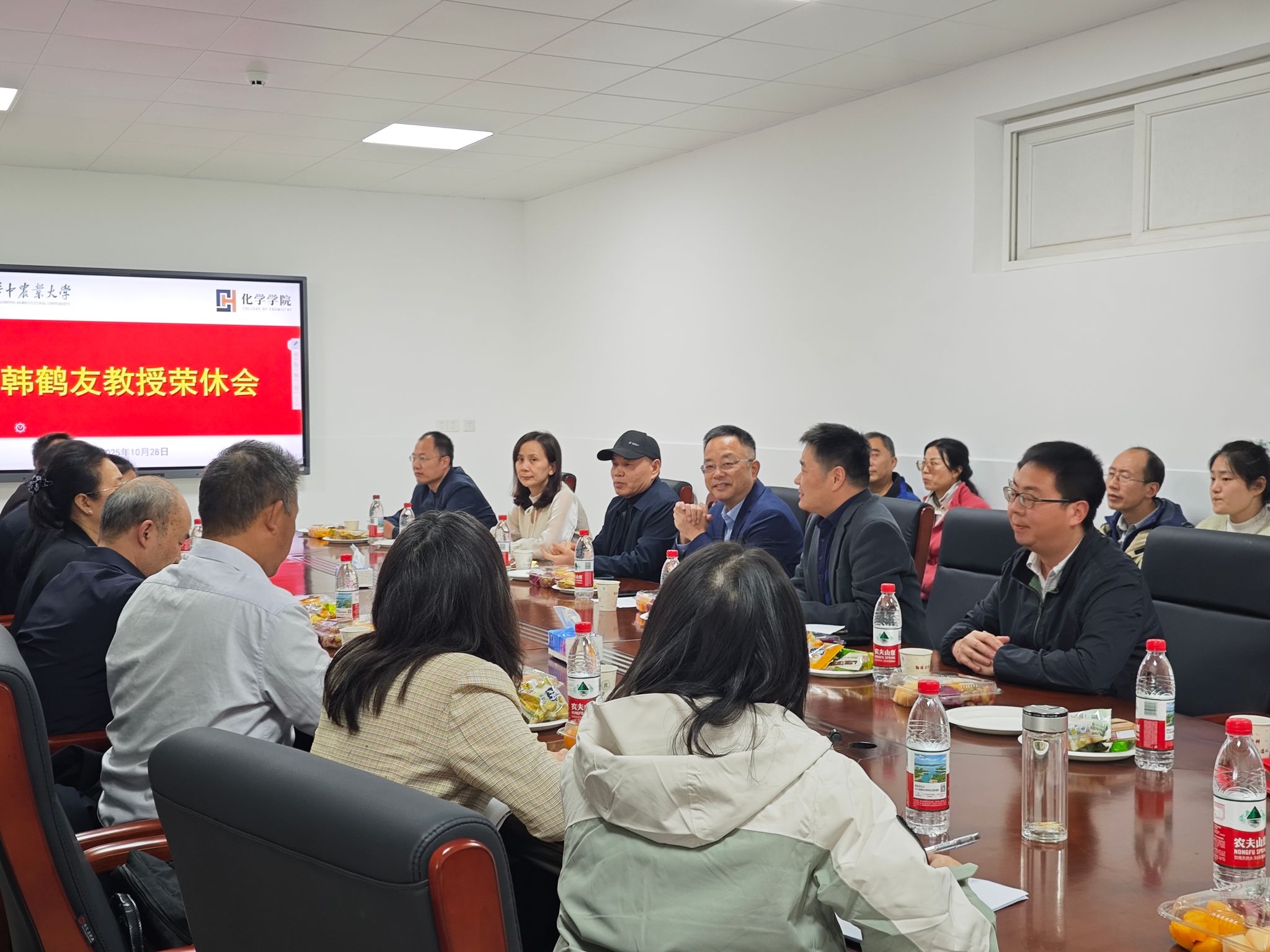 (通讯员:张光政、徐家辉)秋风送爽,丹桂飘香,在这满载感恩与敬意的深秋时节,为向韩鹤友教授数十年如一日在教育、科研与管理岗位上的深耕与奉献致以崇高敬意,2025 年 10 月 28 日下午在化学楼 A106 会议室隆重举行韩鹤友教授荣休仪式。副校长青平、党委书记涂俊才、院长曹菲菲、党委副书记陈华伟等教师代表与专业技术人员代表,以及韩鹤友教授指导的毕业研究生齐聚一堂,共同为这位深耕杏坛的 “引路人” 送上荣休祝福,见证这一温馨而珍贵的时刻。