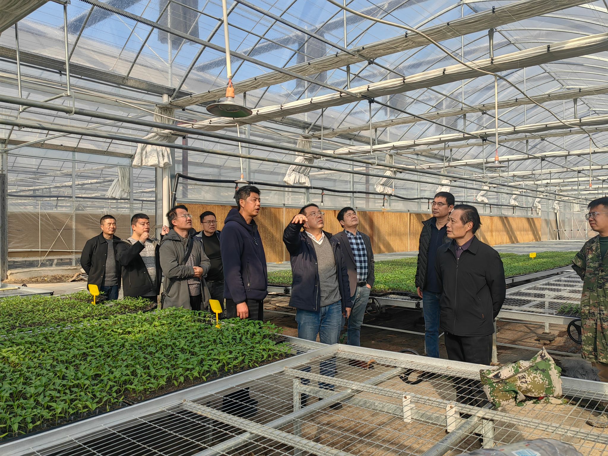 在育苗中心一期工程现场,涂俊才一行详细察看了大棚内辣椒苗长势。别之龙教授围绕蔬菜育苗大棚湿度调控、通风排水、水肥一体化管理、自动栽苗机使用与维护等关键环节,与赵刚深入交流。他建议,种植户要重点抓好苗期病害防控,完善应急防灾设施,从冬季采暖等细节入手严控成本,统筹谋划、系统推进育苗中心二期建设。