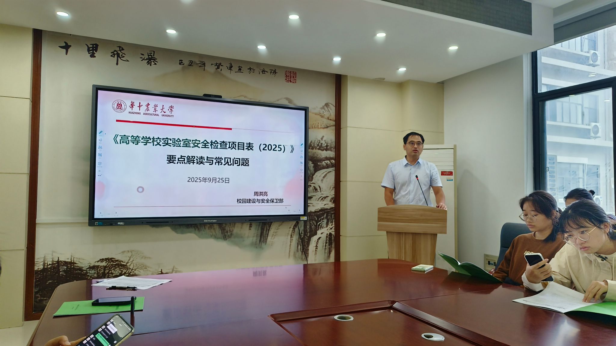 校园建设与安全保卫部周洪亮老师以《高等学校实验室安全检查项目表(2025)》为依据,系统解读了高校实验室安全管理的最新政策与实操要求。他结合多年安全管理经验,重点强调了实验室基础安全、化学安全、辐射安全、特种设备与常规冷热设备与实验室安全分级分类管理等关键环节,明确2025级研究生需通过实验室安全准入考核方可进入实验室,要求同学们牢固树立“生命至上、安全第一”的理念,确保每位同学清楚所在实验室的风险等级与防护要求,严格执行安全操作规程,做到“人人关心、处处关注、时时重视”。